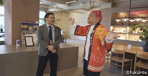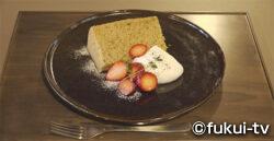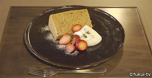 再び走り出した隊長。しかし、すぐに大きな赤い看板を発見!看板には福井の伝統工芸品らしきイラストが描かれていて、「サバエ・クリエイティブ・コミュニティ」の文字が…。中に入ってみると、そこにはシンプルな内装が素敵な空間が広がっていました。実はこの建物、鯖江商工会議所のビルで、1階をリノベーションし、鯖江の優れた製品の紹介や商談、イベントなどができるスペースにしたんだとか。こうした空間を作ったのは商工会議所としては珍しく、全国からも大勢が視察にくるんだとか。さらにここには、シェアキッチンスペースもあり、曜日替わりでカフェが営業しているんです。ということで、この日営業していた「impract(インプラクト)」のシフォンケーキをいただき、ゆったりと過ごした隊長なのでした。