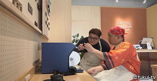 快調に自転車を走らせる隊長。すると、おしゃれな施設を発見。入ってみるとそこは「オプティック テーラー」というお店でした。実はここは、隣に建つ「佐々木セルロイド」というメガネ工場が開いている店舗で、セルロイドのメガネを自分の好みのパーツを組み合わせて作れる、いわゆる「テーラー(仕立屋)」なんです。セルロイドとはプラスチックの一種で昔からあるメガネの素材。でも、最近はあまり使われなくなってきたそうで、「セルロイドの良さを伝えていこう」と開いたのがこのお店なんだとか。ちなみ
