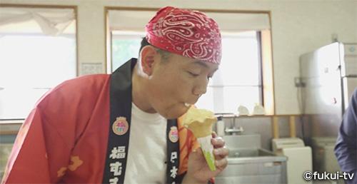 するとディレクターから「アイスを食べませんか?」と、すぐ隣にある「ミルク工房奥越前」を勧められます。大喜びで向かう隊長でしたが、案内されたのは体験工房。実はアイスクリーム作りが体験できるということでやってきたんです。すぐに食べられないとがっかりの隊長でしたが、みるみる変化する様子に大興奮!大汗をかきながら、アイスを完成させ、おいしくいただいたのでした。