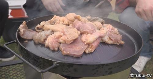 日も暮れはじめ、少し涼しくなった頃、キャンプ場に戻ると、大野商工会議所の巻寄さんと、越前おおのとんちゃんを愛でる会のメンバーが待っていてくれました。これからMIOのアウトドア道具「ロッカクファイヤーピット」と「とんちゃんを愛でる荒島プレート」を使って大野の名物「とんちゃん」をいただきます!愛でる会のメンバーが豪快にとんちゃん作りを始めると、味噌の芳ばしい香りが漂います。「ロッカクファイヤーピット」の2次燃焼による火力と「とんちゃんを愛でる荒島プレート」の熱を滞留させる構造で、一気に焼きあがるんです。濃厚な味噌の旨みが口いっぱいに広がり、後からピリッとした辛味が癖になるホルモンと、とんちゃんの脂も染み込んだ野菜が最高の味なのでした!