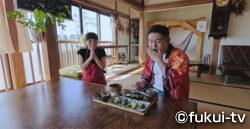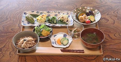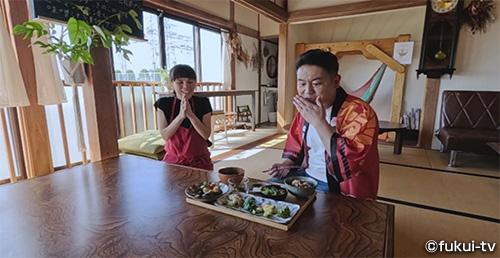 お腹が空いた隊長が食欲を満たそうと訪ねたのは、あわら市にある古民家を改装した「村カフェ とき」。店内は広い畳の部屋に座卓を置いたシンプルなスタイルなんですが、その他に設置されていたのは「ボルダリングの壁」や「ボールプール」。実はこれ、店長が「子育てで大変なお母さんが子どもを遊ばせながら、ゆっくりランチが楽しめるように」と考えたからなんです。しかも、提供される料理のこだわりは「まごわやさしいこ」。取り入れることで健康的な食生活を送ることができる食材のことで、そこに酵素の「こ」を付け加えた言葉なんです。健康的でおいしいものを食べて、家事も育児も頑張って欲しい。そんな店長の願いが込められているんですって。もちろん隊長も体に良いランチを、心ゆくまで楽しみました。