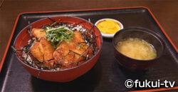 入口から岩場に向かって進む隊長。最初に声を掛けたのは「小南亭」。こちらは様々な味のソフトクリームや、三国らしい食事が楽しめる場所です。ご主人の小南さんに“お店のおすすめ”を聞いてみると、「鯖カツ丼」との答えが。これは福井県が鯖街道とソースカツ丼が有名なことから、考えたオリジナルメニューなんですって。どんな味なのか興味を持った隊長は早速食べさせてもらうことに。見た目がソースカツ丼だったので、しょうゆベースのタレにビックリ!でもこのタレが鯖のカツにぴったりで“うまむすび”なのでした。
