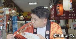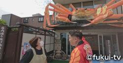 次に訪れたのは、東尋坊で唯一の魚屋さん「やまに水産 本店」。取れたて新鮮な海の幸の販売から、料理の提供までを行っているお店です。早速、店員の蒲生さんおすすめの「イカ焼き」を作ってもらうことに。すると、「焼けるまでに…」と連れていかれたのは最近出来た「映えスポット」!店の裏側の入り口に、大きな「越前がに」の模型が設置されていたんです。案内してくれた西端さんと一緒に写真を撮ったり、再び店内に戻ってプリプリの焼きイカを食べたり、大満足の隊長なのでした。