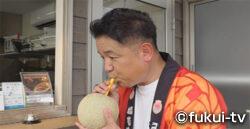「小南亭」で面白いお店の情報をゲットしていた隊長。続いてはその店「東尋坊291」を訪ねてみることにします。「丸のままのフルーツにストローを刺して飲ませてくれる店」と聞き、疑っていた隊長でしたが、店先にある看板にあったのは、聞いていた通りインパクト抜群の写真!店長の細川さんの話によると、ここでは旬の果物を、そのままの形で飲めるジュースにする店なんだとか。早速おすすめのメロンを注文してみます。そして作り方が気になった隊長は作るところも見たいとおねだり。頭の部分に穴を開け、種を取り出すと…、専用の機械で中を撹拌!あっという間にジュースになっちゃいました。まさにフルーツそのままの味を楽しめるジュースに驚いた隊長なのでした。