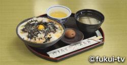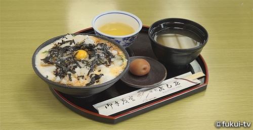 三方五湖の一つ・水月湖のほとりに行列ができる店がある。そんな情報をもらって隊長がやってきたのは「ドライブインよしだ」。実は隊長、前々からこのお店の噂を耳にしていて、一度行ってみたいと思っていたんです。ということで、早速この店の人気ナンバー1のイカ丼をいただくことに。ごはんの上の“とろろ”と新鮮なイカ、そして企業秘密の出汁しょう油がかかった丼は、見た目でもインパクトが強く、思わず写真を撮りたくなります。小さく切られたイカは、食べやすいように考えた結果だそうで、幼児や高齢者が喜んで食べてもらえているんですって。サクサクな食感と、優しい甘さが味わえる逸品でした。