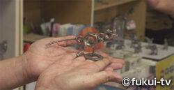 続いてやってきたのは越前大仏の門前町にある「ネジアート」のお店。こちらは、既製のネジとボルト、ワッシャーの3種類だけの部品を使用し、組み合わせて作られた作品を展示、販売しています。作品の中には勝山らしく恐竜をイメージしたものがたくさん!他にも、仏像や動物、アニメキャラクターなど、様々なものが作られていて、隊長は興味津々。そしてこちらでは、製作体験もできるということで、隊長も早速挑戦!見本のティラノザウルスを参考に、店主の松村さんとそのお孫さんに教わりながら作ってみると・・・、不器用な隊長でもなかなかの良い仕上がりになったのでした。