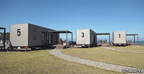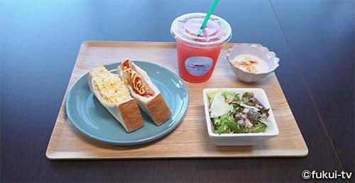続いてやってきたのは、坂井市三国町浜地。ここにはトレーラーをコテージにしたリゾート施設「オルガリゾート」があります。その施設内にあるカフェ「BOARDWALK -ボードウォーク-」が次の目的地。ここのキーワード「開放感」と「景色」は、施設に入るとすぐに実感。トレーラーで仕切られたプライベート空間に、海に向かって真っすぐに伸びる板張りの遊歩道と、海と空が広がる景色は、まさに開放的な美しい景色。訪ねただけで2つのキーワードをクリアしています。でも、今回の目的はモーニング。アメリカのロサンゼルスで出てきそうなモーニングがあるんです。具材たっぷりのサンドイッチに、サラダとヨーグルト、そしてドリンクがついたセット。キラキラ光る海を見ながら、のんびり食べるモーニングは、気分をリフレッシュさせてくれると感じた桑原隊長なのでした。