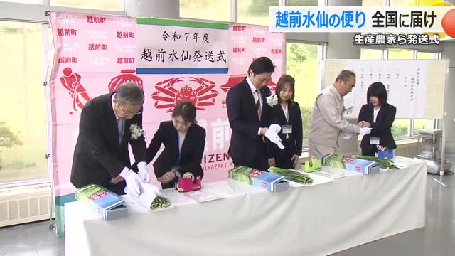 見頃を迎えた花の便りを全国に届けようと14日、越前町で越前水仙の発送式が行われました。