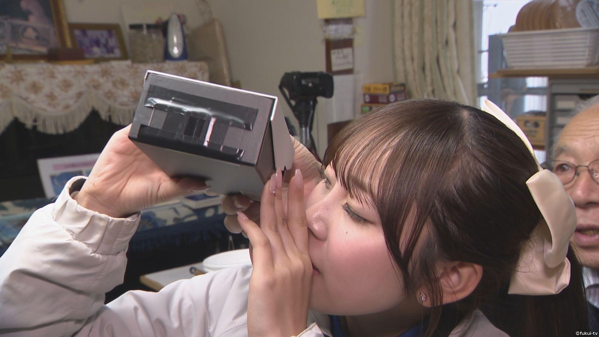手作り実験器具のひとつ、「顕微鏡」を見せてもらい、花びらを覗いた福山研究員は、その性能に驚きます。手作りとは思えない性能に加え、材料費がわずか500円ほどという点にも驚きます。