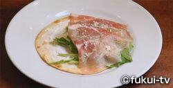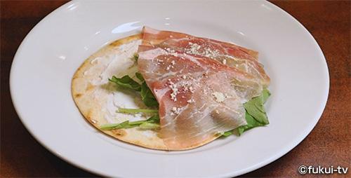 気比の松原付近に戻ってきた隊長。するとここで見つけたのは「Renato」というイタリア料理店です。この店のお勧めは「ピアディーナ」というイタリアのエミリア=ロマーニャ州の郷土食。サンドイッチのようなファストフードなんだけど、パスタに近いものらしいのですが、全然想像つかない…。ということで「食べてみたい」とおねだり。すると小麦粉をベースに作った生地を円形に伸ばし焼いたものに、ルッコラと生ハムなどを挟んだものが登場!具材はいろんなアレンジができるそうなんですが、用意してもらったのはイタリアでも定番の具材なんだとか。初めて食べる料理にワクワクする隊長。シンプルだけどとって「うまむすび」なのでした。