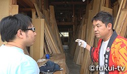 桑原隊長がまず訪れたのは、福井市足羽にあるいちょう材専門店「双葉商店」さん。