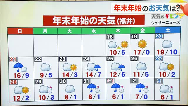気になる年末年始の天気 今週末にかけて最高気温が15度、11月並みの陽気も…29日以降は一転、冬型の気圧配置で雪や雨に 福井