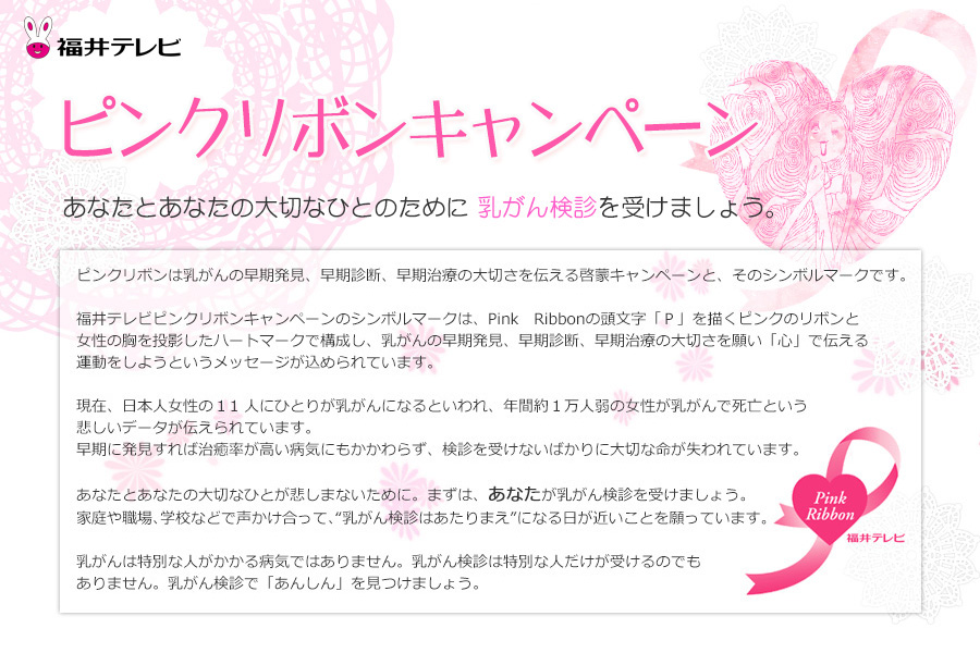 福井テレビピンクリボンキャンペーンの趣旨にご賛同いただきました企業、団体のみなさまにご協賛いただいています。 協賛金の一部はピンクリボン活動の助成金として寄付いたします。 現在放送中のCMの優しい歌声のイメージソングは福井出身のシンガーソングライター、横田はるなさんが作詞作曲。 素敵なイラストは福井市在住のフランス人デザイナー、ヴィルジニーさんにお願いしました。