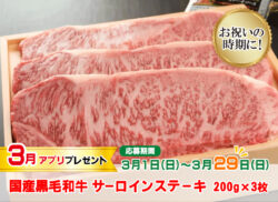 【アプリ会員限定】国産黒毛和牛 サーロインステーキ 200g×3枚を抽選で3名様にプレゼント!